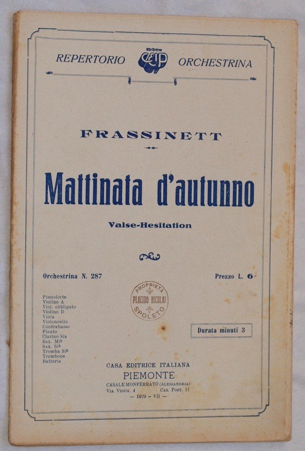 In 8. cm 27x18,5. pp 19. partitura completa per orchestra del 1929 di una canzone.<BR>Caratteristica copertina illustrata d'epoca. Ex libris in copertina. In buone condizioni. a complete score for orchestra of 1929. Carachteristic decorated cover of that period. Ex libris in the cover. In good conditions, wearings.