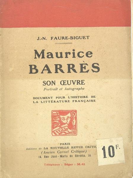 Edition de la nouvelle revue, Paris, 1924. Petit in/8 broché, frontispice et autographe, 77 pages. Maurice Barrès, né le 19 août 1862 à Charmes (Vosges) et mort le 4 décembre 1923 à Neuilly-sur-Seine (Seine), est un écrivain et homme politique français, figure de proue du nationalisme français.