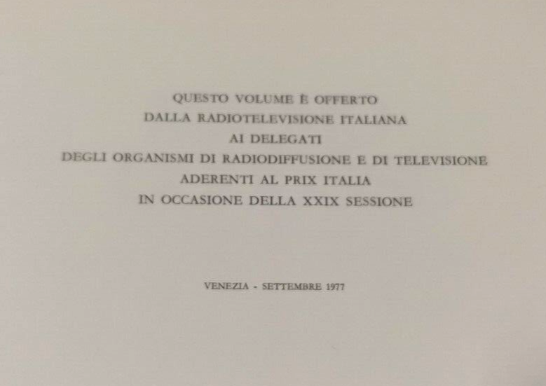 ERI edizioni RAI, 1977. Volume offerto ai delegati degli organismi di radiodiffusione aderenti al prix Italia XXIX sessione ed è personalizzato con il nome del destinatario.