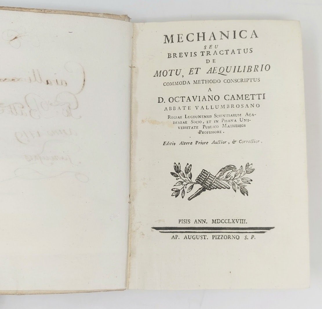 >in-8, pp. VI, 174, legatura in cartone rustico coevo, titolo ms. al dorso (piccole mancanze) Corredato di 17 tavole inc. in rame ripieg. f.t. con figure geometriche e macchinari meccanici. Seconda edizione, ampliata e corretta, di questo trattato sul moto e l'equilibrio dei corpi. L'autore (Gattinara, Vercelli, 1711 - Pisa 1789), abate e poi padre generale dei Vallombrosani, fu per oltre quarant'anni professore di geometria all'Università di Pisa, chiamatovi dal Granduca di Toscana, del quale divenne anche teologo ufficiale. Scrisse vari trattati sulle sezioni coniche, la geometria euclidea, l meccanica dei fluidi, ecc. Bell'esemplare, nota di possesso alla controsguardia anteriore "Cavalli Gio Batta anno 1779..." Riccardi I, p. 214, 4.2. DBIt. vol. 17, p. 200.