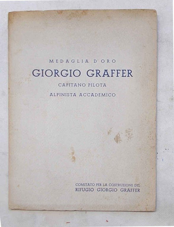 In 4° (cm. 29,5 x 20,5); pagg. 36; con 1 ritratto a colori applicato su tavola in cartoncino semirigido f.t., numer. illustraz. fotograf. e "rendering" e pianta del rifugio tratte dal progetto dell'architetto Apollonio di Trento; leggera carton. origin. Minime ondulazioni per umido, ma esemplare molto buono. VG-. ** Accurata edizione. Con un lungo ricordo dell'alpinista e dell'aviatore a cura di Marcello Pilati e una descrizione del rifugio "Graffer" di Ettore Castiglioni, che scrive: "Un rifugio intitolato a Giorgio Graffer non poteva sorgere che in Brenta".