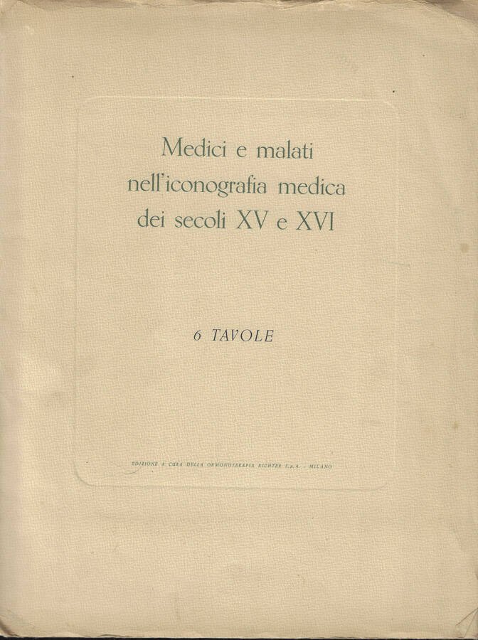 Edizione a cura della Ormonoterapia Richter di Milano. Cartellina in cartoncino, lievemente brunita e consumata lungo i margini contenente all'interno 6 tavole sciolte che riproducono silografie originali di testi medici e chirurgici del '400 e '500 ed apparse sulle copertine di 6 fascicoli della rassegna bimestrale di letteratura endocrinologica Ormonoterapia edita dalla Ormonoterapia Richter. Buono stato.