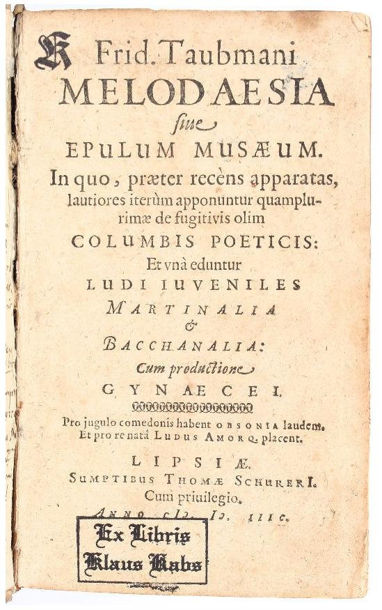 I. FIRST EDITION. Taubmann's most successful and comprehensive collection of neo-Latin poetry, which was reprinted in 1604, 1615, 1622 and in 1634. It was dedicated to two of his major patrons: “Friedrich Taubmann gestaltet die Widmungsadresse zu seine Melodaesia an Friedrich Wilhelm I., Herzog von Sachsen-Weimar (1562-1602) und Georg Friedrich I., Markgraf von Brandenburg (1539-1603), als doppelseitige, dyptichonartige Inschrift, die er mit der antiken römischen epigraphischen Weiheformel ‘Libens merito offert consecratque' abschliesst. Nach der Inschrift folgt direkt der erste Satz der Widmung” (K.A.E. Enenkel, Die Stiftung von Autorschaft in der neulateinischen Literatur, ca. 1350-ca. 1650: zur autorisierenden und wissensvermittelden Funktion von Widmung, Vorworttexten, Autorportraits und Dedikationsbildern, Leiden, 2014, p. 119).