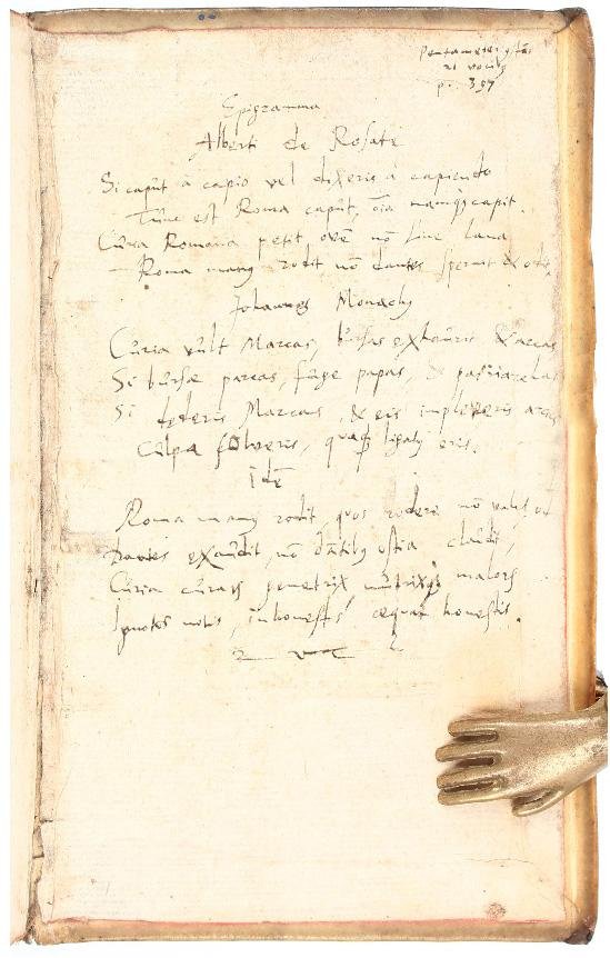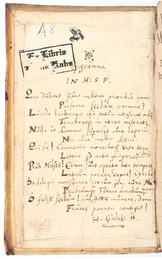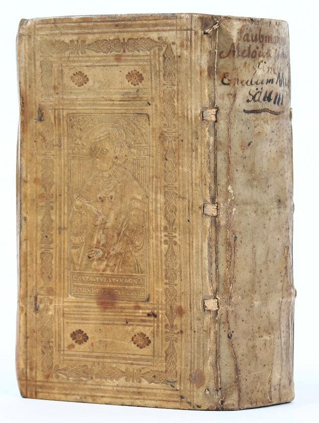 Two works in one volume (158x96 mm). Contemporary blind-stamped vellum with overlapping edges and inked title on spine, front panel with “Iustitia” stamp (signed with the monogram “D P”, see Haebler I, 325), and the initials “HGH” and date “1599” in black ink, back panel with “Casta Lucretia” stamp (unsigned and undated), red edges (lacking the ties). Taubmann: [24], 614, [10] pp. Collation: )(8 ):(4 A-Z8 Aa-Qq8. Printer's device on the last page. Meibom: [32] leaves. Collation: A-D8. Woodcut ornament on the title page, full-page woodcut coat-of-arms on title-page verso. On the front pastedown, on the first title page and on the following leaf stamps “Ex-libris Klaus Kabs” and “KT”. On the front pastedown handwritten poem in a contemporary hand “Epigramma in H:S.P.” signed by H. Gödek H., i.e. the dean of Hildesheim und Poeta Laureatus Heinrich Gödeke (Henricus Goedekenius Hildesianus, 1580-1609, see J.L. Flood, Poets Laureate in the Holy Roman Empire: A Bio-bibliographical Handbook, Berlin/Boston, 2019, II, pp. 680-681), who is also the person who commissioned the binding. On the back flyleaf and pastedown one or two contemporary hands have copied a few verses from Ovid and some epigrams of Albertus de Rosati and Johannes Monachus. Small oxidation hole to l. Pp6 (pp. 603/604) with some loss of text, browned throughout, some foxing and staining, but overall a very good, genuine copy in a nice, signed and dated contemporary binding.