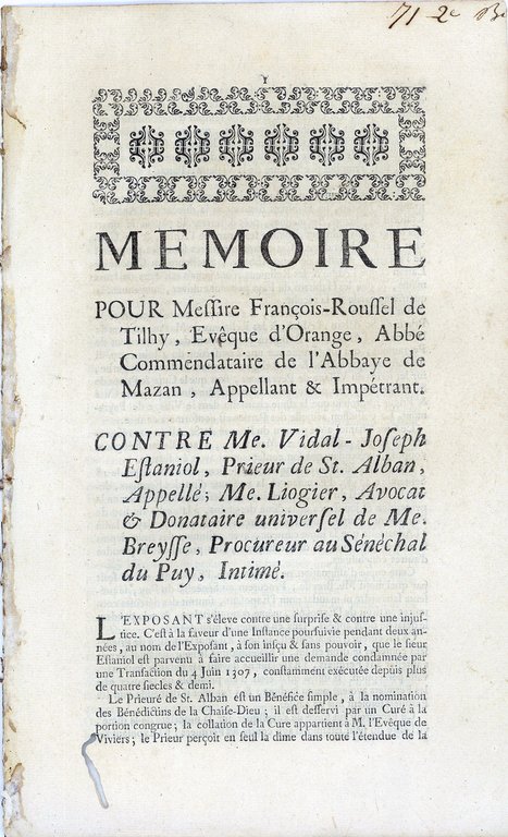 MEMOIRE pour Messire François Roussel de Tilhy, Evêque d'Orange, Abbé Commendataire de l'Abbaye de Mazan, appellant et impétrant. Contre Me. Liogier, Avocat en la Cour, donataire universel de Me. Breysse, Procureur au Sénéchal du Puy, intimé.