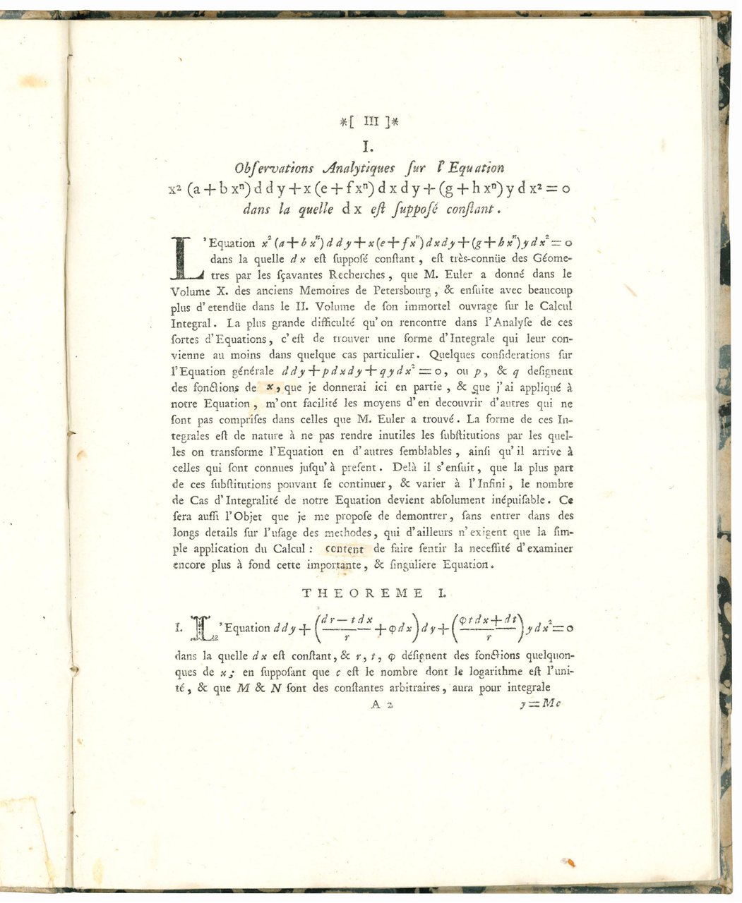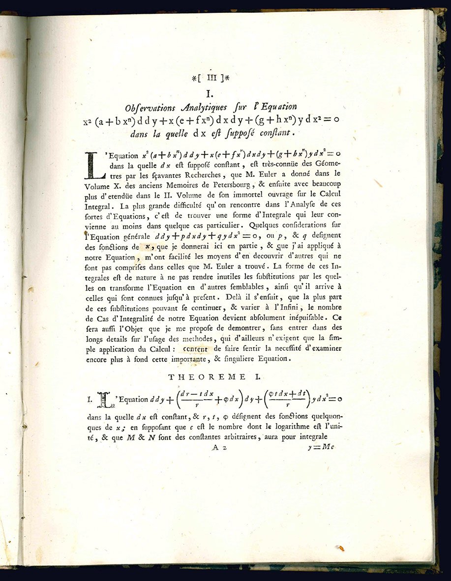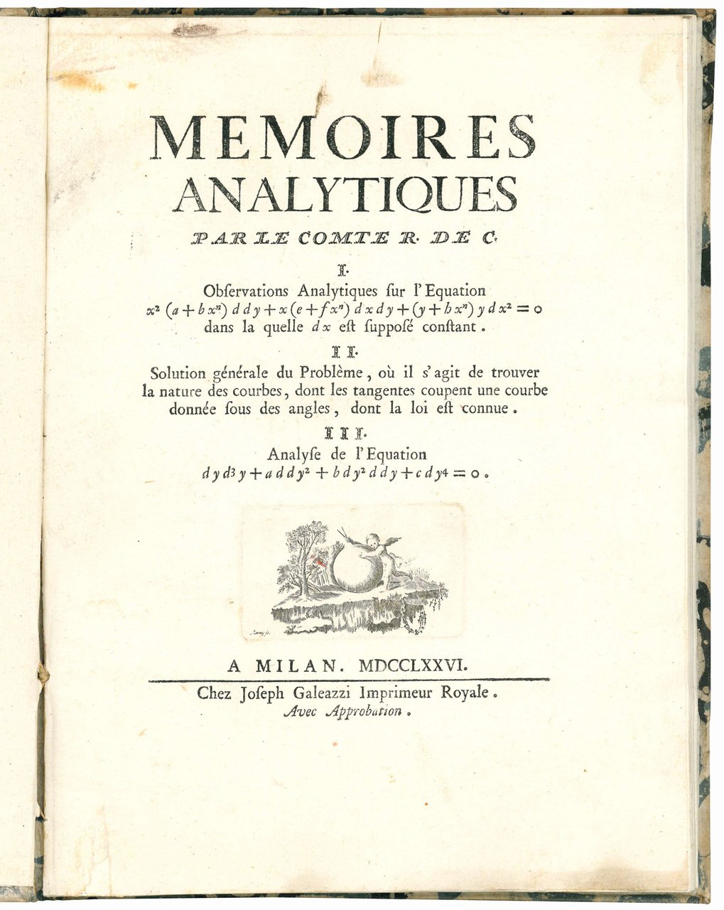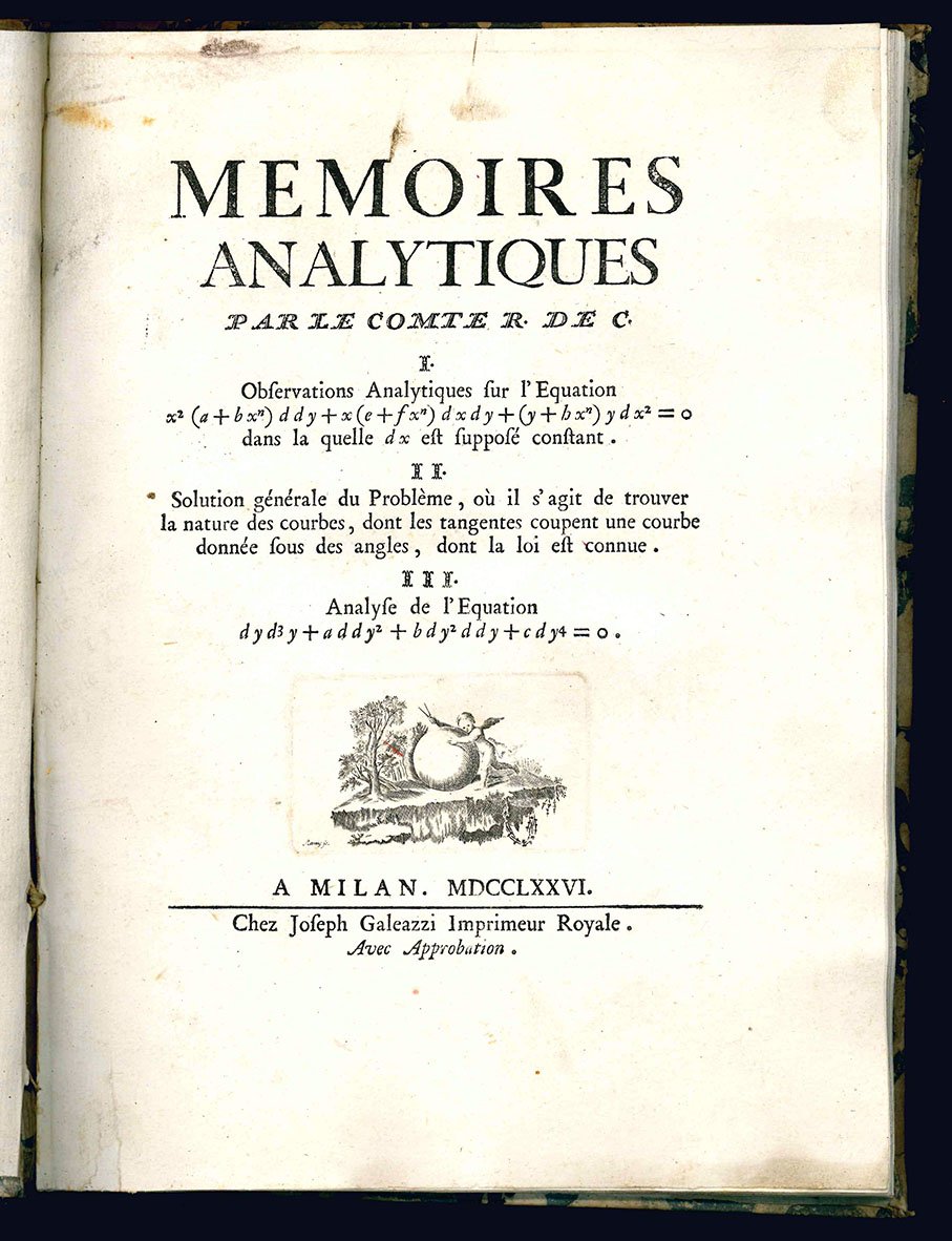 Memoires analytiques par le comte R. de C. 1. Observations analytiques sur l'equation ... 2. Solution générale du problème, ou il s'agit de trouver la nature des courbes,... 3. Analyse de l'equation…