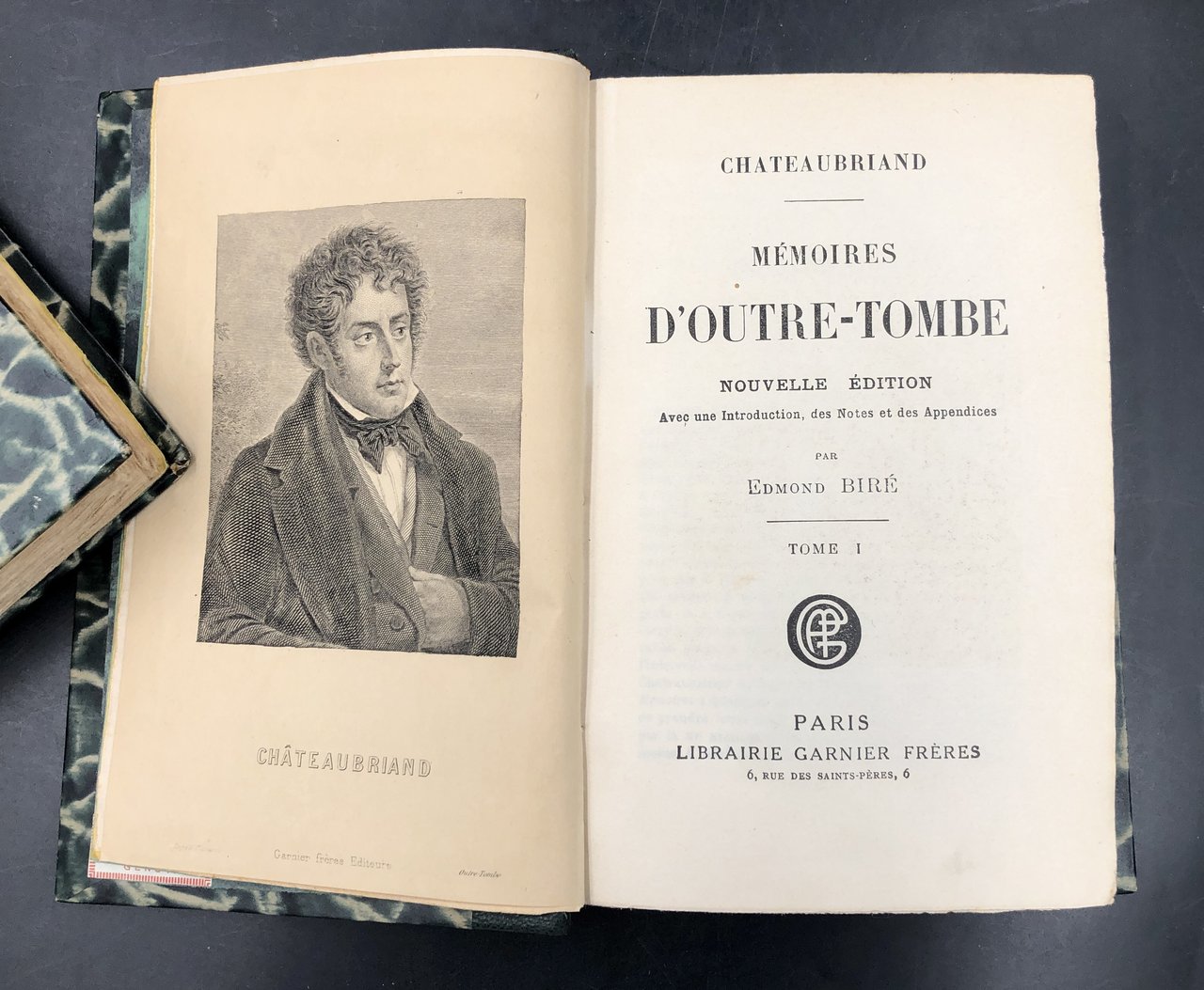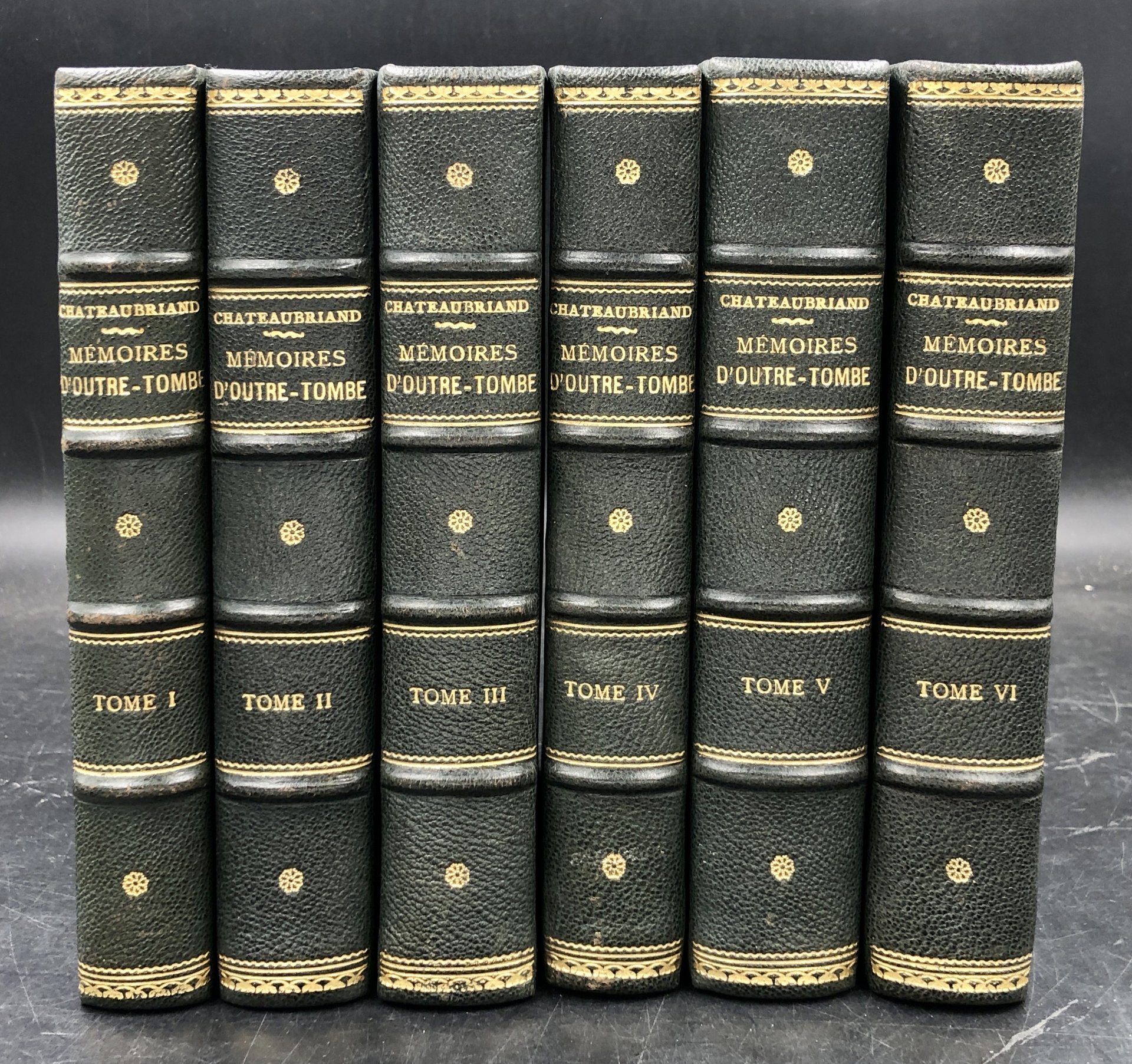 6 voll. in-8° (cm. 19,4x12), in un superbo insieme di LEGATURE coeve in mezza pelle verde scuro, 4 nervi ben rilevati, fregi, filetti e titli oro ai dorsi, sguardle in carta decorata a tonalità di verde, conservati all'interno i piatti ant. e post. delle brossure originali. Alcune annotazioni a matita, di un solerte lettore, rade e per nulla invasive, a qualche margine e a due sguardie. Ex libri recente al verso dei piatti ant. Pp. LV, 484 + 1 TAVOLA f.t., pp. (4), 608 + 3 TAVOLE f.t., pp. (4) 678 + 2 TAVOLE f.t , (1), pp. (4), 520 + 3 TAVOLE f,t, pp. (4), 662 + 3 TAVOLE f.t., pp. (4), 631 + 1 TAVOLA f.t. In tutto almeno 13 TAVOLE f.t. incise su acciaio da vari su disegni di Philippoteaux di cui 6 in antiporta (perlopiù ritratti: 2 dell'Autore, Talma, Joseph Chénier, Alexandre I.er, Benjamin Constant, le général Foy, Madame de Chateaubriand, madame Récamier, Madame De Genlis, Silvio PELLICO, la Duchesse de St. Leu, Lafayette. CHATEAUBRIAND, nel 1791, in piena Rivoluzione francese dalla quale all'inizio si era sentito attratto, si allontanò dagli eccessi popolari, passò vari mesi in America, poi fu ferito nell'esercito controrivoluzionario, sfuggì al Terrore in Inghilterra; nel 1811 iiniziò queste memorie di 30 anni di una vita emblematico dle padre del Romanticismo, combattuto tra princìpi rivoluzianri, sete di libertà, e bisogno di ordine; le voleva pubblicate postume, ma le pubblicò nel 1836 per garantirsi la vecchiaia. Un grande capolavoro, oggetto di avversioni e di di entusiasmi.