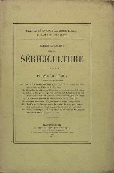 C.Coulet Montpellier 1877. In/4, Broché, 34 p., 23 p., 23 p.18 p., 60 p., 29 p., 60 p. Recueil d’intérêt sur l’industrie et l’exploitation du ver à soie : Le système de PASTEUR, Etc. L’art d’élever les vers à soie . Méthodes de sélection. Éclosion des graines.