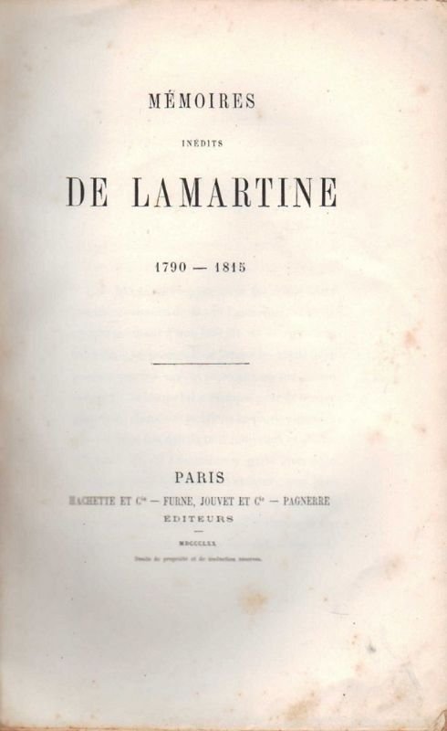 In-8° grande, legatura novecentesca in tutta tela con titolo in oro su tassello di pergamena al dorso; pp. IX(1)-369(3). In numeri romani la Préface di Louis-François Nicod de Ronchaud (1816 - 1887), storico francese, amico e discepolo di Lamartine. Divisa in sette libri, l'opera copre i primi venticinque anni della vita del poeta. Edizione originale, postuma (Vicaire, IV, 1022). Scrive Ronchaud: '(.) Nous publions la partie achevée, qui contient des détails tout nouveaux et pleins d'intéret. M. de Lamartine y parle avec suite pour la première fois de son enfance (.). De là cette fraicheur qu'on respire dans ces pages, tombées cependant d'une main fatiguée, pleine de travaux et de jours. (.) Là est pour nous le veritable intéret de ce livre. L'homme politique, le grand écrivain populaire ont achevé leur role dont le siècle a été rempli; on ne le voit plus que de loin illuminer d'un reflet de gloire la retraite du poete et ses souvenirs. Ce qui reste de Lamartine, au soir d'une vie si pleine de pensée et d'action, et ce qui parait ici, c'est l'homme lui-meme (.) revivant ses souvenirs et les racontant parfois, d'une lèvre souriante et d'un coeur ému (.)'. Piatti leggermente imbarcati; rare leggere fioriture; ma nel complesso ottimo esemplare, a pieni margini, impresso su carta forte.