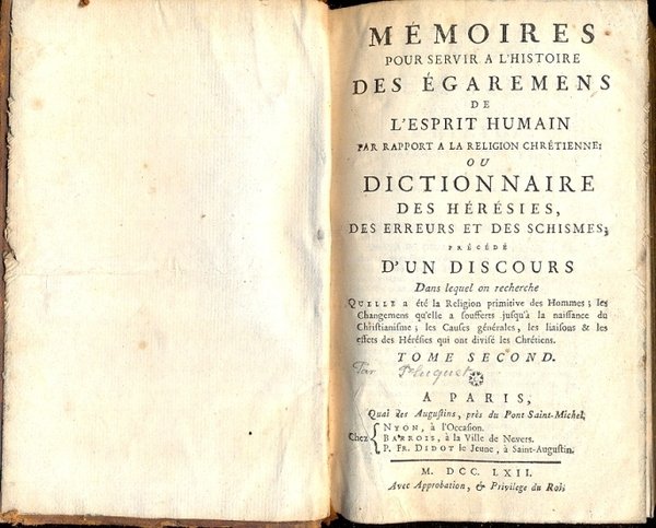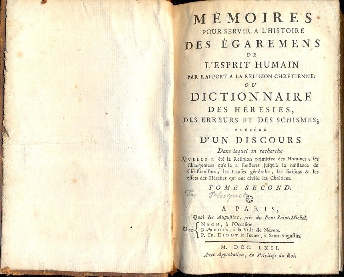 Memoires pour servir a l' Histoire des Egaremes de l' Esprit Humain par rapport a la Religion Chretienne: ou dictionnaire des Hèrèsies, des erreurs et des Schismes; prècèdè d'un discours dans lequel on recherche.