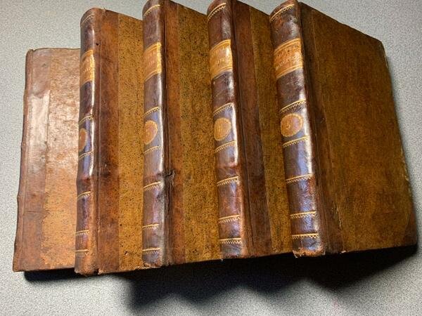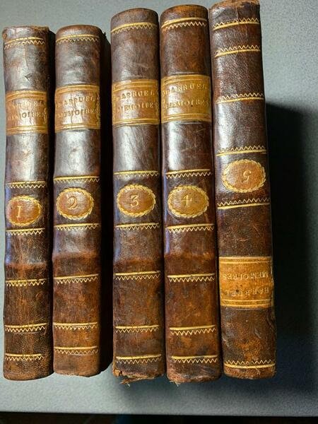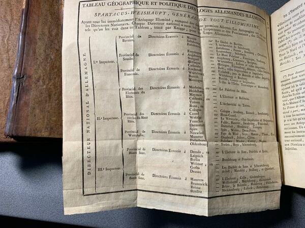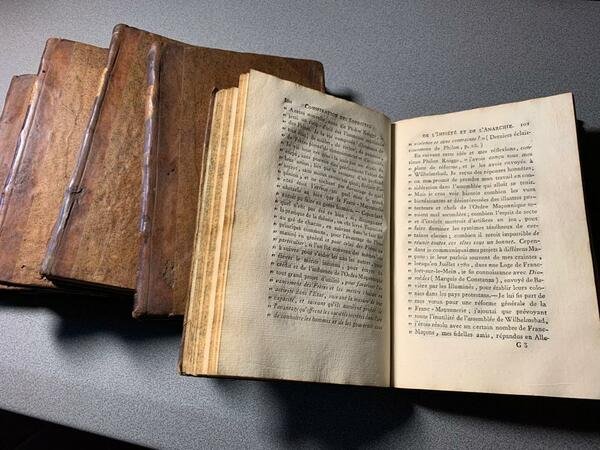 Conque tomi in 8° (cm 11,8 x 18,5), legature mezza pelle coeva, con angoli, dorsi ornati da motivi e fregi dorati, tasselli bicolori con titolo, autore, numerazione del tomo, tracce d'uso ai piatti; pp xx, 304; viij, 336; xx, 300; xx, 288; (4), 328. All'interno del tomo quarto, tavola più volte ripiegata: 'Tableau géographique et politique des loges allemandes illuminées'. Esemplare in buone condizioni. Augustin de Barruel (1741-1820), elemosiniere del Principe di Conti, emigrato in Inghilterra dopo i massacri di Settembre, inventò - o smascherò?- la 'tesi del complotto' rivoluzionario fomentato dai framassoni e della setta degli Illuminati (setta fondata il primo maggio 1776 da Adam Weishaupt, 'Spartacus', precursore del pensiero marxiano), per rovesciare monarchia, clero e ogni istituzione sociale, a partire dalla sua prima cellula, la famiglia. L'A. sviluppò brillantemente la sua tesi in quest'opera monumentale (prima edizione, 1798), veemente condanna dei 'philosophes', primo fra tutti Voltaire, poi D'Alambert ed il sovrano illuminato Federico di Prussia; chiave di volta per la comprensione dell'ideologia contro-rivoluzionaria che individuava radici diaboliche nella Rivoluzione Francese. Preziosa fonte per l'analisi delle sette segrete nel secolo decimottavo: trattato che fu a lungo vittima di una 'congiura del silenzio', messa in atto dalla storiografia ufficiale. 'L'ouvrage est divisé en trois parties. La première traite de la conspiration antichrétienne ; la deuxième de la conspiration contre les rois et la troisième de la conspiration des sophistes, de l'impiété et de l'anarchie, c'est à dire de la combinaison des deux premières conspirations'. (Godechot, La Contre-Révolution, p. 52). Esemplari censiti in COPAC. Caillet n. 111