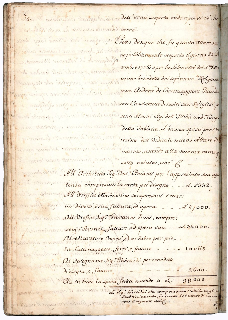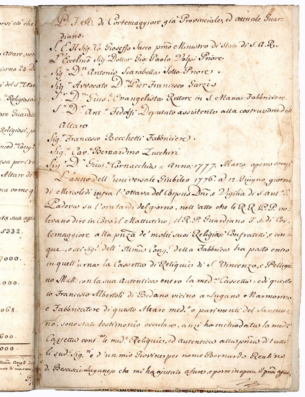 L'ultima parte della relazione (pp. 71-74 e carta aggiunta finale), intitolata Altre Memorie aggiunte, riferisce invece dei lavori compiuti fra il 1771 e il 1776. In quell'occasione l'architetto Antonio Brianti progettò un nuovo altare maggiore in marmo policromo con ai fianchi teste d'angeli e ornamenti floreali in bronzo che fu realizzato dallo scultore ticinese Francesco Albertolli. Il Brianti rifece anche la facciata dell'organo e le due cantorie. Il nuovo altare, di cui il manoscritto fornisce anche il dettaglio di tutti i costi, fu scoperto il giorno di Natale del 1776, mentre alcuni mesi prima, il 12 giugno dello stesso anno, il guardiano del convento e ministro provinciale dell'ordine Francesco di Cortemaggiore aveva solennemente deposto una cassetta con le reliquie dei Santi Martiri Vincenzo e Pellegrino; dal momento che la cassetta aveva spazio per altre reliquie, l'autore fornisce istruzioni anche su come aprirla nel caso “dovesse riporsi qualche altra più insigne Reliquia, o Corpo intero d'un Santo, giacché vi si è lasciato un vacuo sufficiente” (p. 73).