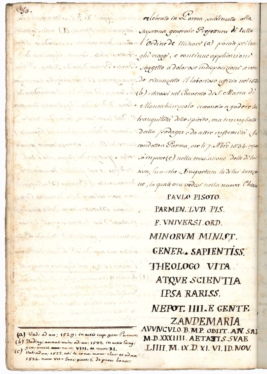 Interessante manoscritto, apparentemente inedito, che narra in modo estremamente accurato e dettagliato la storia della fabbrica della chiesa della Santissima Annunziata di Parma, i cui lavori furono cominciati sotto Ottavio Farnese nel 1566 e terminati all'incirca verso il 1650.