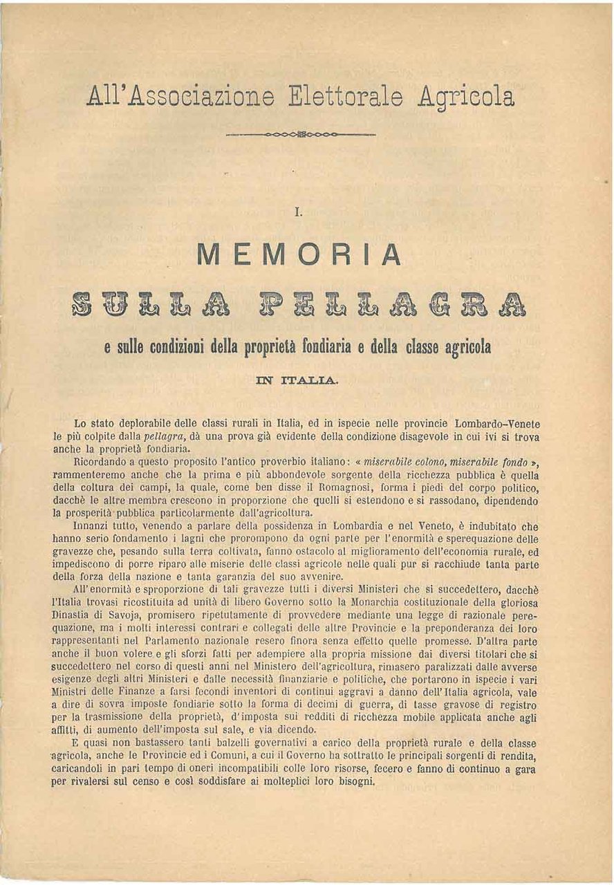 Memoria sulla pellagra e le condizioni della proprietà fondiaria e della classe agricola in Italia. Associazione Elettorale Agricola