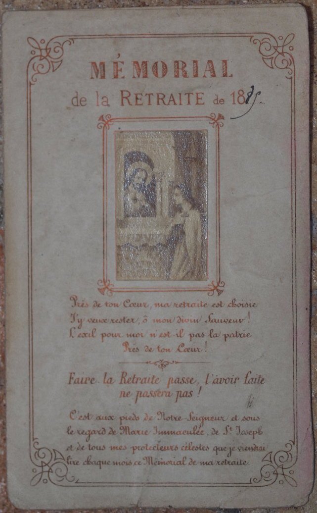 In 24. Dim. cm 11x6,5. Pp. (2). Interessante immaginetta del 1889, un "Memorial de la Retraite". Al verso preghiera. In buone condizioni. Interesting holy image of 1889, a "Memorial de la Retraite". Prayer in the verso. In good conditions.