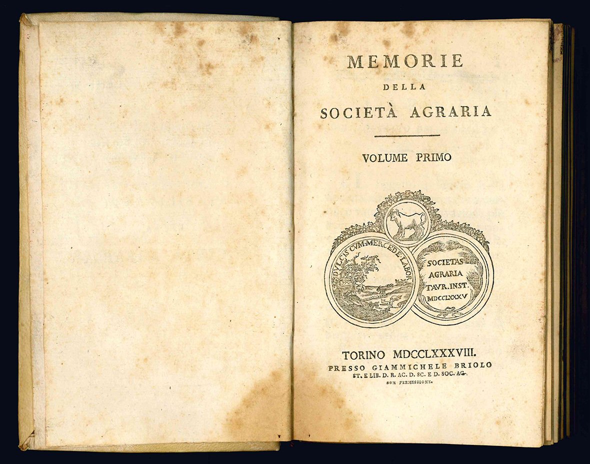 Questo primo volume della gloriosa Reale Società Agraria, di cui fece parte a suo tempo anche Cavour, contiene lo Statuto che occupa le prime 26 pagine, inoltre una Memoria premiata nel 1787 dalla Società sull'incremento dei bovini negli Stati Sardi e altre due Memorie piu' brevi.