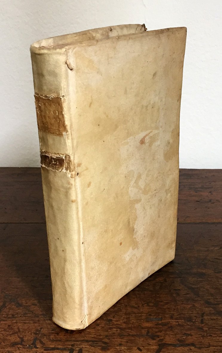 Un volume di nove in 8vo (mm 188x112); pp. [4], XCIX, [1], 164. Alone violaceo al margine superiore dell'intero volume, che tuttavia indebolisce la carta solamente alle ultime 2 cc. Pesante alone all'angolo inferiore interno della prima parte del volume. Mancano le pp. LXIX-LXXII. Piena pergamena coeva con doppio tassello e titolo in oro al dorso. Tagli spruzzati in rosso. Minime mancanze al dorso, un po' sciolto.