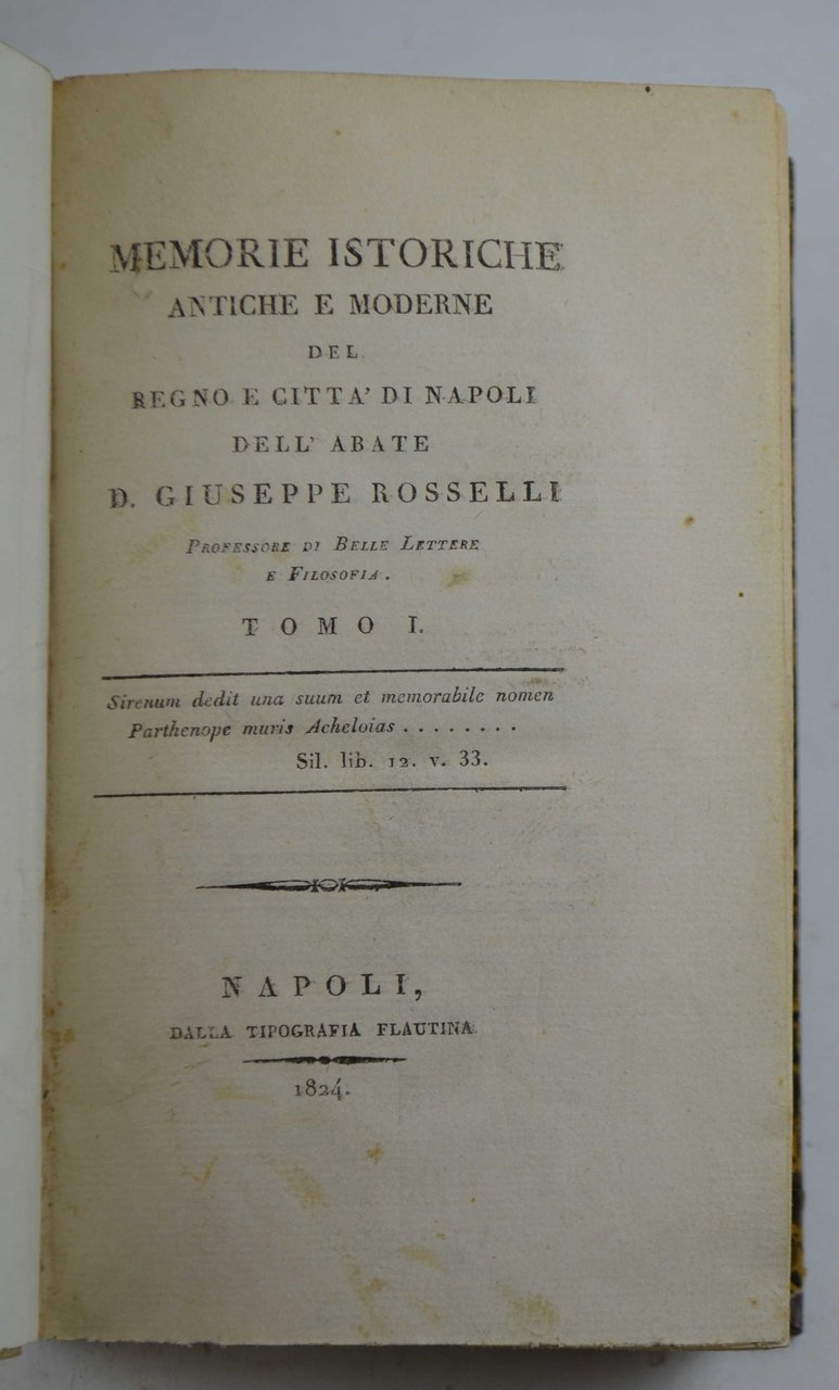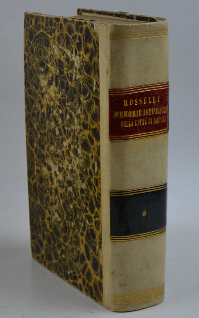 Cm. 21,5, pp. 716. Solida leg. del tempo in mezza pergamena, dorso liscio con titoli in oro su doppio tassello bicolore. Esemplare fresco, marginoso ed in ottimo stato di conservazione. Ex libris Carresi. Edizione originale ed unica, rara. Cfr. Dura (15489); Fera-Morlicchio (I, 1233): "Queste memorie avrebbero dovuto contenere più volumi, ma per la morte dell'autore fu pubblicato solo il primo. Nell'opera si tratta dell'origine remota della cittàè di Napoli, sua antichità, si descrivono le sue bellezze naturali, la popolazione e le varie forme di governo. Il tutto descritto con cognizione storica e cronologica.".
