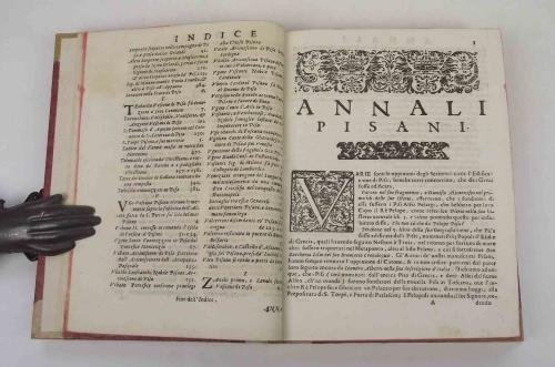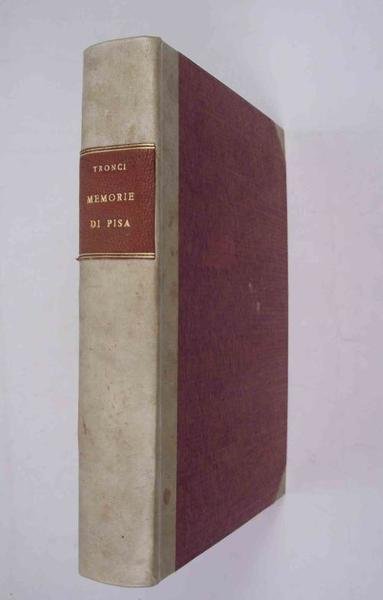Cm. 21, pp. (32) 508 + 1 cb. Solida ed elegante legatura ottocentesca in mezza pergamena con punte e titoli in oro su tassello al dorso. Tagli rossi. Bell’esemplare, in ottimo stato di conservazione. Edizione originale di quest’opera che può giustamente essere considerata una delle più vaste fonti di notizie per la storia di Pisa. Lozzi (3684): “Bello e raro”; Romagnoli: “assai raro”; Piantanida (933): “non ci sono note altre edizioni di quest’importante opera postuma divenuta oggi molto rara”.