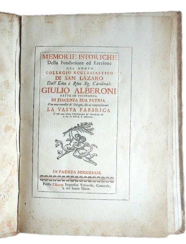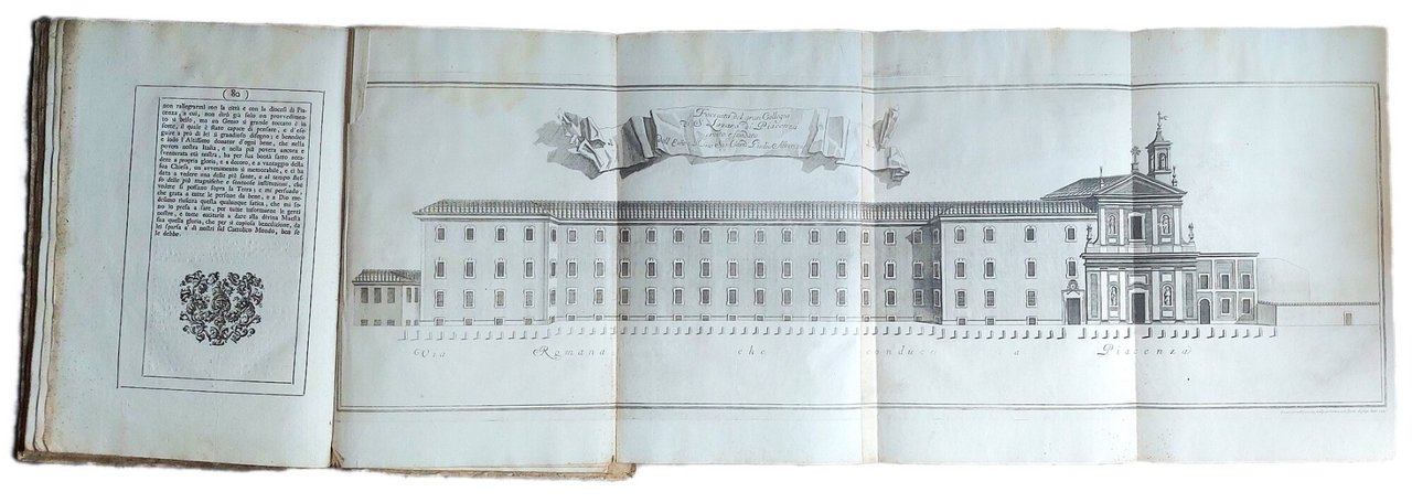 >In-folio (mm 425x285), pp. VII (incluso frontespizio impresso in rosso e nero), 80, legatura coeva in cart. decorato (dorso rinforzato). Testo entro doppia bordura, alcuni testatine, finalini e capilettera xilografici. Poste in fine al volume sono 7 grandi tavole ripiegate, che raffigurano il Collegio Alberoni di Piacenza da diverse angolature: la facciata, le piante del pianterreno, del primo piano nobile e del piano superiore, la veduta in prospettiva del Cortile, gli spaccati dello scalone e lo spaccato in profilo e prospetto dello Scalone del Collegio. Le grandi tavole furono incise a Roma da Francesco Mazzoni e illustrano la grandiosa costruzione in pianta ed in alzato. Esemplare su carta forte, con le tavole integre, benché ripiegate. Prima ed unica edizione, di inusuale e grandiosa opera sul Collegio di San Lazaro, inizialmente destinato alla formazione del clero e della nobiltà e ancora oggi un importante centro educativo, punto di riferimento culturale per la città di Piacenza. Fu eretto con lo scopo di offrire un'istruzione di alta qualità che combinasse l'insegnamento delle lettere e delle arti con l'educazione morale e religiosa. L'edificio era ormai un lebbrosario in rovina, quando il cardinale Alberoni (1664-1752) dal quale prende il nome, pensò di convertirlo in un collegio ecclesiastico, dopo aver ottenuto l'approvazione papale il 13 luglio 1732. Giunto a Piacenza poco dopo, iniziò i lavori di demolizione e ricostruzione, dimostrando di possedere buone conoscenze architettoniche. La prima pietra fu posta il 4 settembre 1732 e i lavori proseguirono fino al giugno 1746 quando, durante la Guerra di Successione Austriaca, l'edificio fu quasi completamente distrutto: sopravvissero solo l'ingresso, lo Scalone, la Biblioteca, la chiesa e la sacrestia. Nonostante ciò e l'età avanzata, l'Alberoni nel 1748 impiegando più di 100 operai, riuscì a portare a termine il suo progetto, un grandioso quadrilatero a tre piani – circa 90 metri per 72 in pianta. Nell'agosto del 1751 esaminò i futuri chierici del Collegio, scegliendone 18. Da notare che tuttora il Collegio ha una buona raccolta di rilegatura cinquecentesche: LE LEGATURE RINASCIMENTALI ITALIANE DEL COLLEGIO ALBERONI DI PIACENZA di Federico Macchi