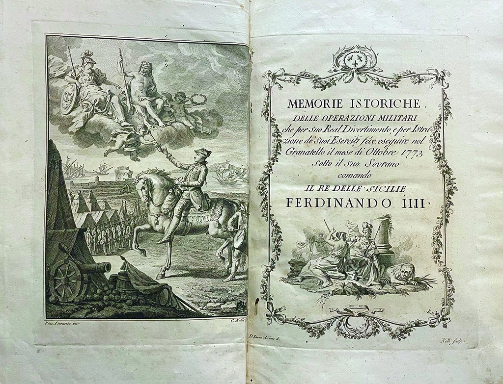(Borbonica-Granatello-Ferdinando IV-Fig. ‘700) SCALFATI Matteo. Memorie istoriche delle operazioni militari che per suo Real Divertimento e per Istruzione de’ Suoi Eserciti fece eseguire nel Granatello il mese di Ottobre 1773, sotto il suo Sovrano comando il Re delle Due Sicilie Ferdinando IV. Napoli, (in fine) Stamperia Simoniana 1774. In-folio (37,5x24), leg. m. pelle con angoli, dorso a cord. con tit. in oro; 4 cc. compr. il bel front. inciso; pp. 120 con bella antip. incisa in rame dal Nolli raffig. l’allegoria della Gloria e Ferdinando IV a cavallo, e 11 grandi tavole, incise su disegno di Michelangelo D’Aprea, raffig. la veduta e la pianta (cm. 41,5x70) del luogo destinato alle manovre. Rarissimo.