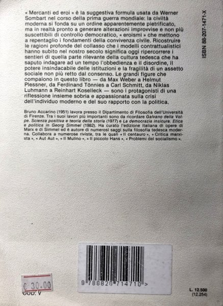 Mercanti ed eroi è la suggestiva formula usata da Werner Sombart nel corso della prima guerra mondiale: la civiltà moderna si fonda su un ordine apparentemente pietrificato, ma in realtà pronto a generare alterazioni improvvise e non più suscettibili di controllo democratico, "eroismi" che mettono a repentaglio i fondamenti della convivenza civile. Ricostruire le ragioni profonde del collasso che i modelli contrattualistici hanno subito nel nostro secolo significa oggi ripercorrere i sentieri di quella parte rilevante della cultura tedesca che ha saputo indagare ad un tempo l’obbedienza e il disordine, il potere insindacabile delle istituzioni e la fragilità di un assetto sociale non più retto dal consenso. Le grandi figure che compaiono in questo libro - da Max Weber a Helmut Plessner, da Ferdinand Tönnies a Carl Schmitt, da Niklas Luhmann a Reinhart Koselleck - sono protagonisti di una riflessione insieme sobria e appassionata sulla crisi dell’individuo moderno e del suo rapporto con la politica.