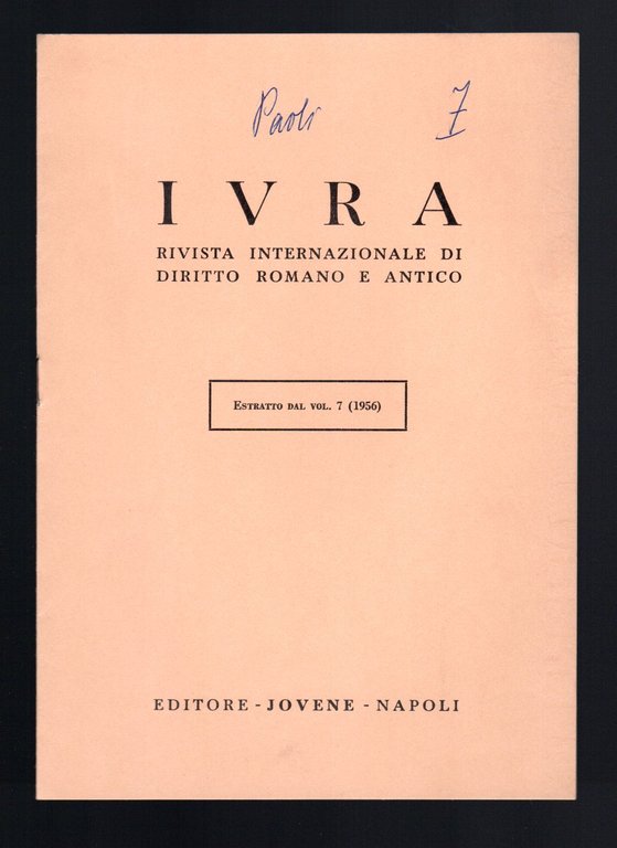 Opuscolo vintage. Estratto dal volume 7 da Ivra - Rivista Internazionale di Diritto Romano e Antico. Segni di biro in copertina. Usura da scaffale. Ordinario segno del tempo.