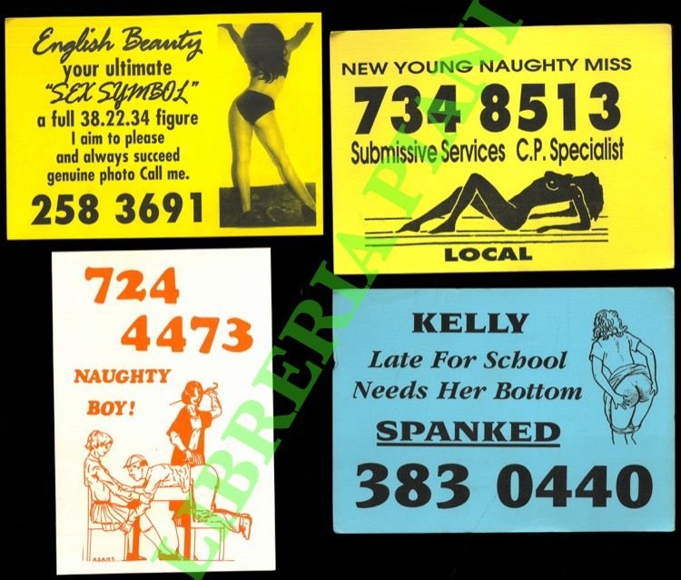 (Londra, anni '90), lotto di 30 cartoncini a colori con espliciti riferimenti alle attività 'promosse' e numeri telefonici reali. Spesso un disegno esplicativo é presente. Curiosa collezione.