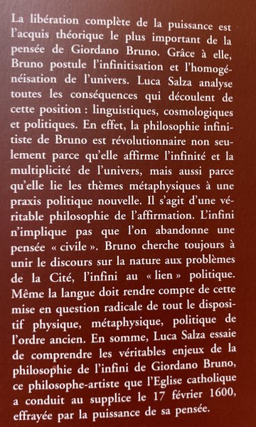 La liberazione totale della potenza è la più importante conquista teorica del pensiero di Giordano Bruno, che, grazie ad esso, postula l'infinitizzazione e l'omogeneizzazione dell'universo. L'autore analizza le conseguenze linguistiche, cosmologiche e politiche che derivano da questa posizione: la filosofia di Bruno è quindi rivoluzionaria perché lega temi metafisici a una nuova prassi politica, è una vera filosofia dell'affermazione.