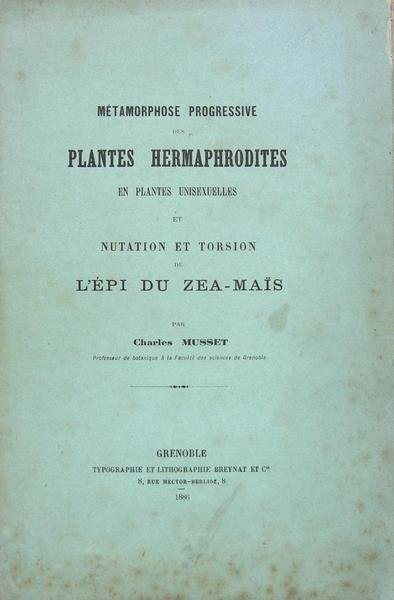 Grenoble, Breynat, 1886. Plaquette grand in/8 brochée, couverture imprimée, 27 pages. Exemplaire non coupé. L’auteur fut professeur de botanique à la Faculté des sciences de Grenoble. Le présent ouvrage fut inséré dans le “Bulletin de la société de statistique des sciences naturelles et des arts industriels du département de l’Isère” en 1889.