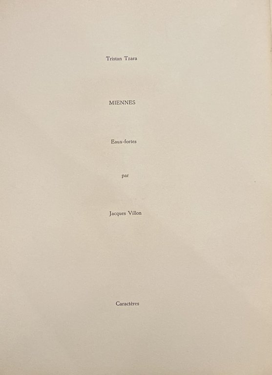 Esemplare numero 76 di 111 (su carte e con contenuti differenti, 101 a numerazione araba, 10 annotati con lettere dell'alfabeto da A a J.), uno degli 80 sur pur fil Johannot con 7 acqueforti originali di Villon f.t. Firma sulla pagina del colphon da Tzara e Villon. La tiratura del testo è stata curata dalla Stamperia "Caracrères". L'impressione delle acqueforti eseguita sui torchi dall'Atelier de l'Ermitage a Parigi. Fogli sciolti. Legatura editoriale, astuccio con qualche macchia e lievi segni.