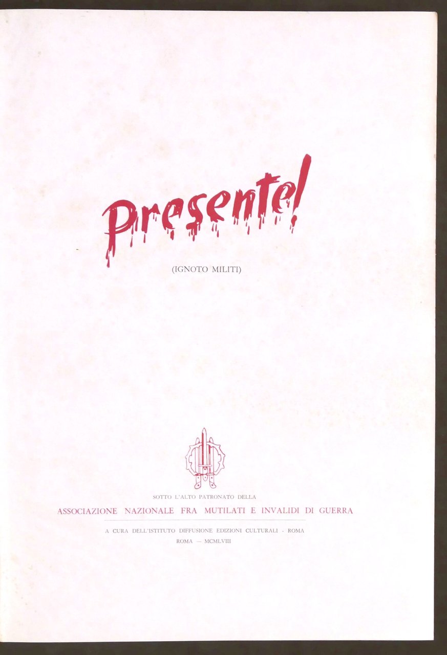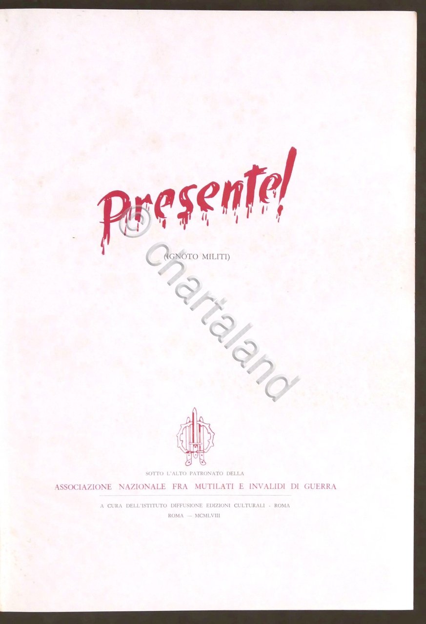 Presente! (ignoto militi) - Sotto l'Alto Patronato della Associazione Nazionale fra Mutilati e Invalidi di guerra - ed. 1960 Contiene: 1. La Prima guerra mondiale (1914-1918), di Mario Tingralli. 2. La Seconda guerra mondiale (10 giugno 1940 - 8 settembre 1943), di Vittorio Bisceglie. 3. La Seconda guerra mondiale (8 settembre 1943 - 8 maggio 1945), di Rodolfo Albanese. Pag. 549 con illustrazioni. Copertina rigida - Testo in italiano. Condizioni molto buone.