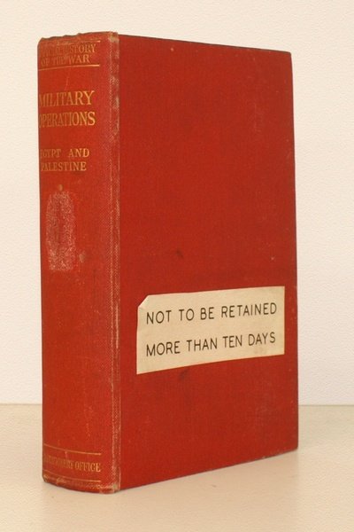 8vo., First Edition, on laid paper, with 6 large folding panoramas in sepia-toned collotype, 16 full-page maps in red and black and 2 full-page diagrams in the text, and front and rear endpaper maps, most original tissue guards present; original red cloth, gilt back, case a little shaken (but binding entirely sound) else a very good, bright, clean copy. THIS COPY FORMED PART OF THE BRACKENBURY BEQUEST TO THE STAFF COLLEGE, CAMBERLEY. It bears the fine engraved armorial Brackenbury bookplate on front paste-down, the Camberley stamp (cancelled) together with several date stamps on half-title, and 'not to be retained' label on front board. Published in the official series 'History of the Great War', based on official documents by direction of the historical section of the Committee of Imperial Defence. This first (of two) volumes covers the commands of Maxwell and Murray, and deals with the defence of Suez, the advance across Sinai into Southern Palestine and First and Second Gaza. It also includes the campaign against the Senussi, minor operations in the Sudan and against the Sultan of Darfur, and the outbreak of the Arab Revolt (aided by Lawrence). Co-compiler Cyril Falls is the author of the standard WWI bibliography 'War Books' (1930). The separate portfolio of maps is not present with this copy. Scarce in this original edition. Enser, p.250; Falls, p.53.