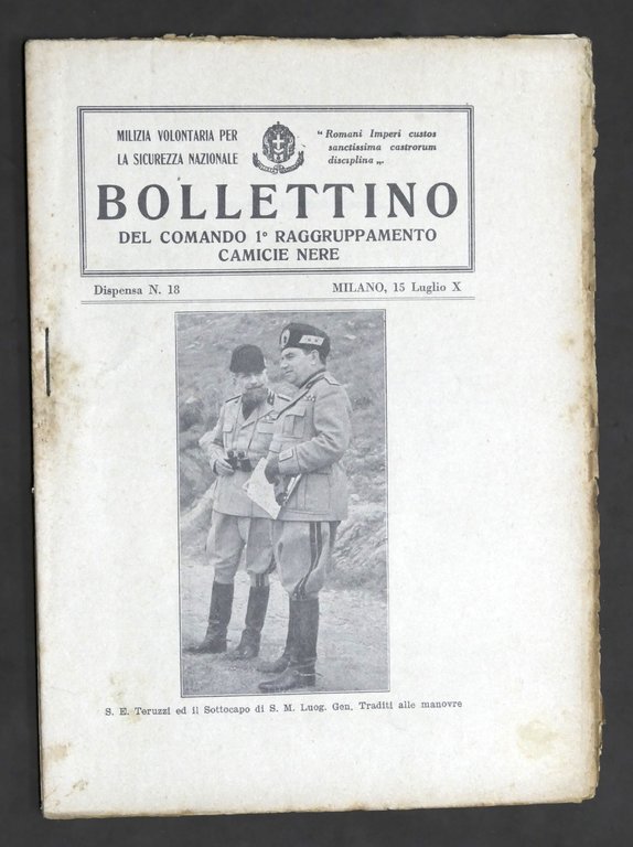 Milizia Volontaria Sicurezza Nazionale - Bollettino del Comando 1° Raggruppamento Camicie Nere - N. 18 - 1932 Pag. 52 Copertina morbida - Testo in italiano. Condizioni molto buone. Copertina come da foto.