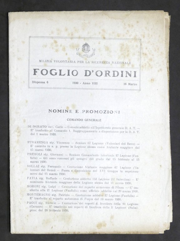 Milizia Volontaria Sicurezza Nazionale - Foglio d'Ordini - 16 marzo 1930