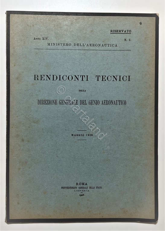 Ministero dell'Aeronautica - Rendiconti Tecnici della Direzione Generale del Genio Aeronautico N. 2 - Maggio 1926 Testo in lingua italiana. Pagine 87 con illustrazioni e tavole. Copertina morbida. Condizioni molto buone.