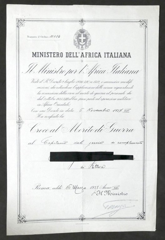 Ministero Africa Italiana Certificato conferimento Croce Merito di Guerra 1938