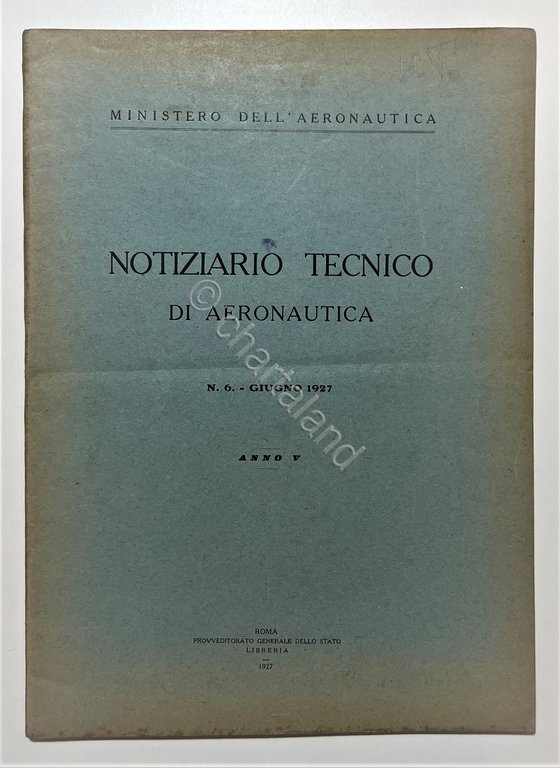 Ministero dell'Aeronautica - Notiziario Tecnico di Aeronautica N. 6 - Giugno 1927 Testo in lingua italiana. Pagine 71 con illustrazioni e tavole. Copertina morbida. Condizioni molto buone.