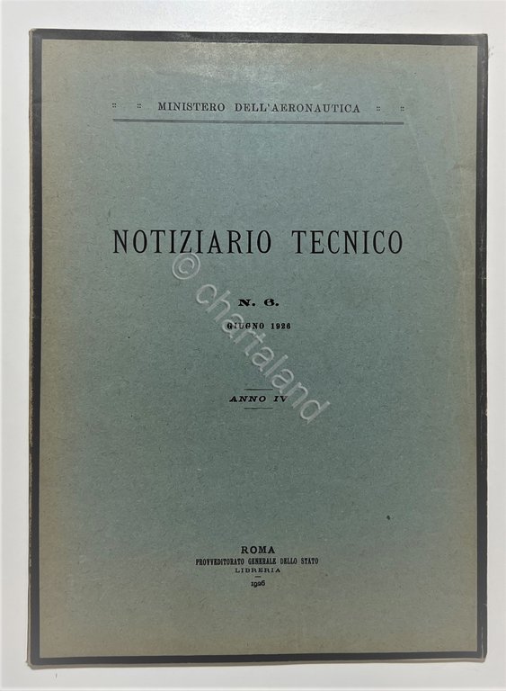 Ministero dell'Aeronautica - Notiziario Tecnico N. 6 - Giugno 1926 Testo in lingua italiana. Pagine 67 con illustrazioni e tavole. Copertina morbida. Condizioni molto buone.