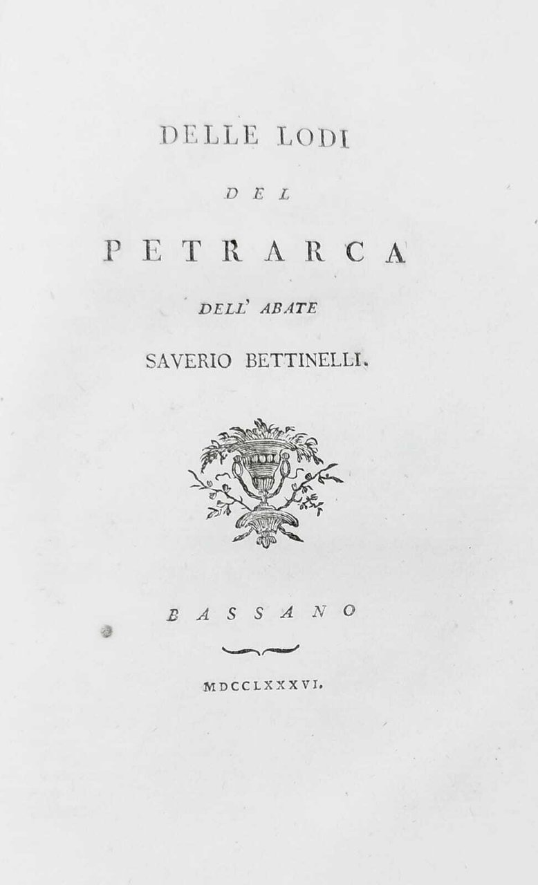 Miscellanea di 3 opere differenti legate in un unico tomo: Elogio di Monsignor Gasparo Cerati patrizio parmigiano cavaliere priore della chiesa conventuale dell'ordine di Santo Stefano, provveditore generale dell'Università di Pisa, memebro della R. Società di Londra, accademico di Berlino, di Bordeaux, dell'Instituto di Bologna, della Crusca, della Società Colombaria, e di altre società, Parma, Reale Stamperia, 1778; Bettinelli Saverio, Delle Lodi del Petrarca, Bassano, 1786; Tiraboschi, Girolamo, Elogio storico di Rimbaldo Avogaro e canonico primicerio della Chiesa di Trivigi scritto dall'Abbate Cav. Girolamo Tiraboschi, 1791. Marca tipografica, incisione all'antiporta della terza opera. in ottavo leg. pelle, titolo manoscritto al dorso, tagli spruzzati 3 opere in 1 tomo: pp. XXXII, 122, (2); pp. 85, (1); pp. 77, (3) Buono (Good) Buon es..