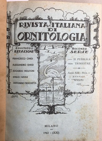 In- 8°, pp.circa 200, legatura in mezza pelle con titolo in oro al dorso, presente la brossura editoriale della rivista italiana di ornitologia Anno XIII num. 1 Elenco degli artticoli contenuti nella rivista: Moltoni Edgardo. Notizie sulla comparsa del Beccofrusone in Italia nel 1941 - 42, Milano 1943 estratto dalla Rivista di ornitologia. Bonelli. Canto e contegno del Venturone. MOltoni, Ulteriori osservazioni sugli uccelli della Valtellina. Tratti da Rivista di Ornitologia. Giribaldi Laurenti, Esemplari rari della collezione Giulio Giribaldi Laurenti. Moltoni, Erratismo in femmine di fagiano di monte. Moltoni, Gli uccelli della provincia di Aosta, 1 carta geografica e 3 tavole f.t., Moltoni, Straordinaria comparsa di Cincie More nell'Italia Settentrionale, qualche ill. n.t. Sommani, Osservazioni ornitologiche effettuate sulle montagne tendasche, Moltoni, La ricomparsa delle Crociere nel 1943, 1 ill. n.t. Moltoni, Le Parre e le Gru esistenti nell'Africa Orientale Italiana, 2 tavole a colori f.t. De Beaux, Appunti su un fenicottero catturato presso Genova Pesenti, Il passo degli uccelli nella provincia di Bergamo Alcuni opuscoli sono presenti in duplice copia.