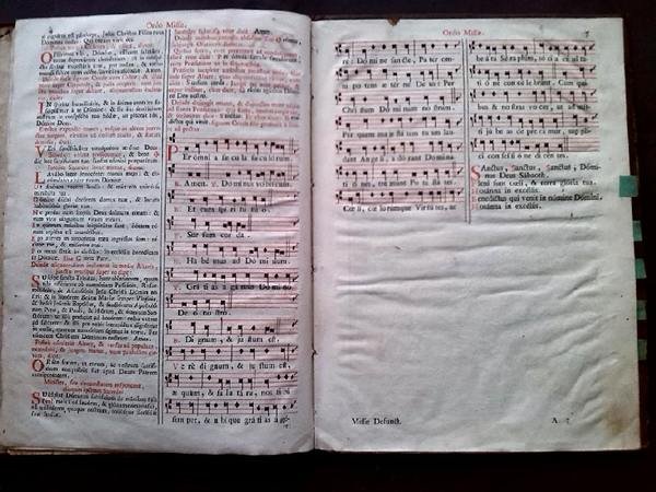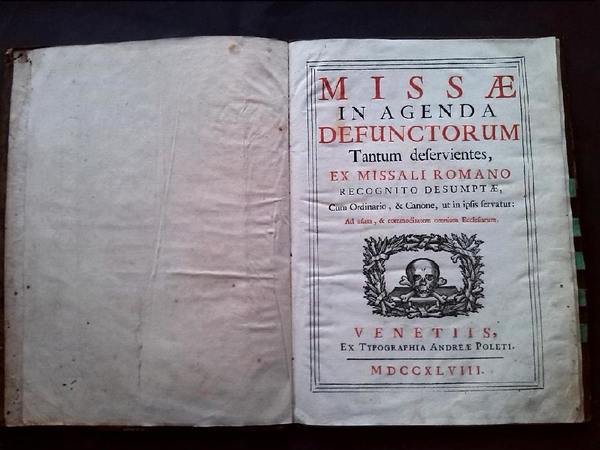 4°. 24 SS. 2-farbig rot und schwarz gedruckt, mit gest. Titelvign., 1 ganzs. Kupferstich, 8 gest. Initial. und 4 SS. Noten. Blindgepr. Ldr. d. Zt. Der Kupferstich zeigt die Kreuzigung Christi. - Im Rand mit 5 eingekleb. Blattweisern. - In unt. Rand meist gering gebräunt und fingerfleckig. Im w. Rand anfangs mehr. kl. Wurmspuren. Vors. knitterig, etw. angestaubt und mit hs. Vermerken von alter Hand. Einbd. stärker lädiert, mit Wurmspuren, Wachsflecken und Absplitterungen. Römische Liturgie, Messbücher 18. Jahrhundert, Italien, illustrierte Werke Bücher