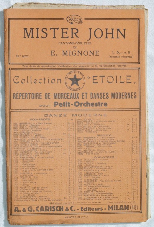 In 8. cm 27x17,5. pp. 20. Partitura completa per orchestra senza data ma del 1930 circa di una canzone. Caratteristica copertina illustrata d'epoca. Timbri di appartenenza all'interno, note manoscritte. In ottime condizioni. a complete score for orchestra of 1930's. Carachteristic decorated cover of that period. Ex libris inside, manuscripted notes. In good conditions.