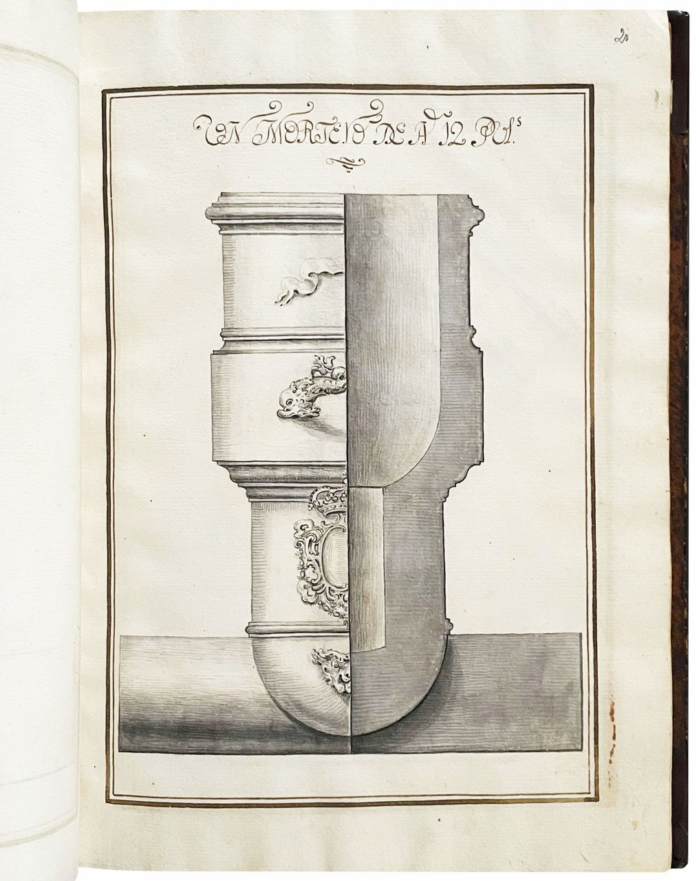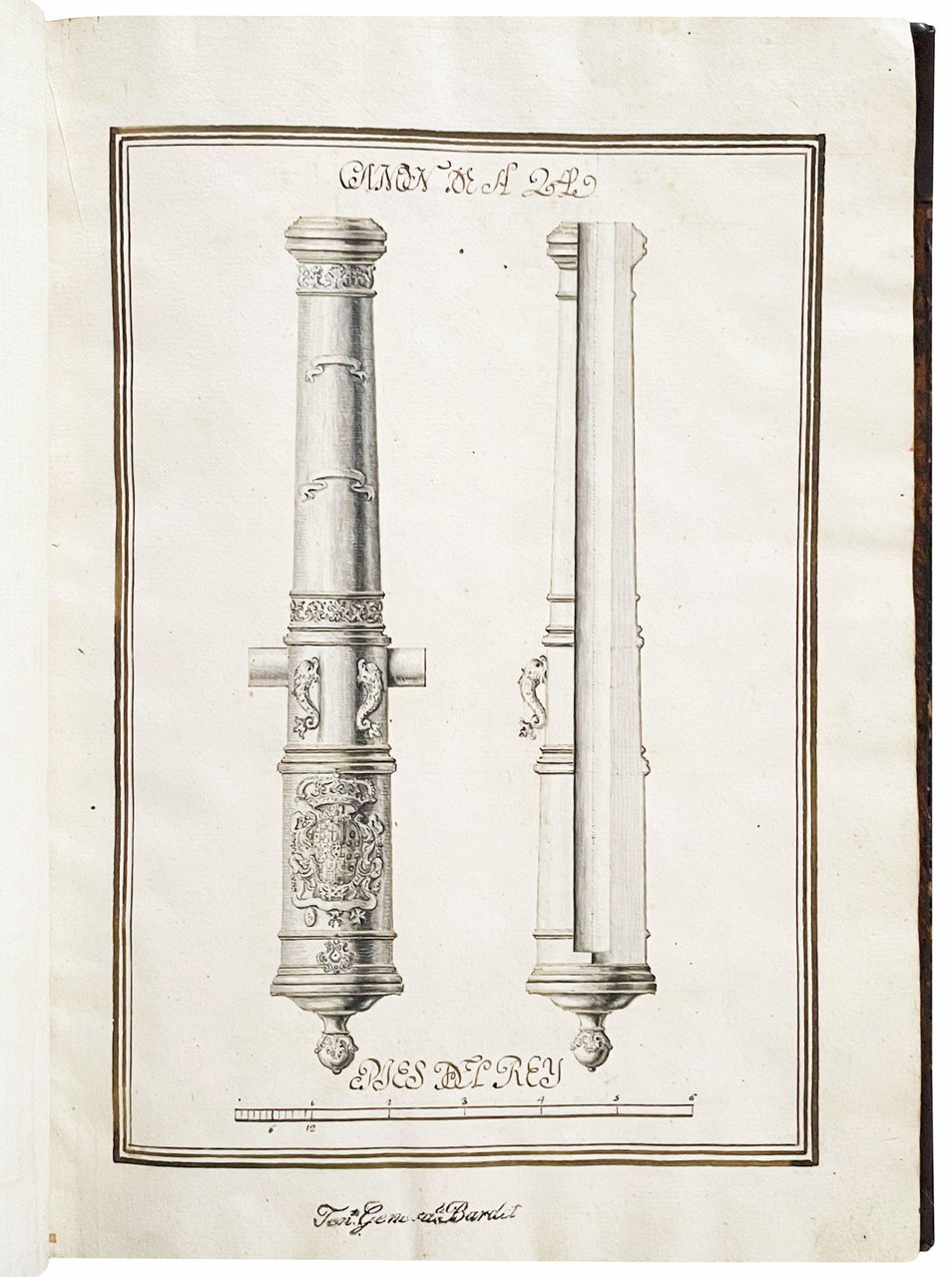 Folio (256x185 mm). 108 unnumbered leaves, of which 50 are blank. Allegorical title page and 57 illustrations in pencil and ink within a douple inked frame and with inked caption titles, measurement units and explanations. The plates show cannon, mortars, gun carriages, gun wheels, ammunition carts, various tools and ramrod devices. Some of the illustrations are applied. Contemporary mottled calf, righly gilt spine, sprinkled edges (worn and rubbed). On the front pastedown bookplate Mark Dineley; on the title page and first plate stamp “Ten. Genera.le Bardet”. The fourth digit in the date on the title page is not clearly readable. Some minor foxing, overall well preserved.