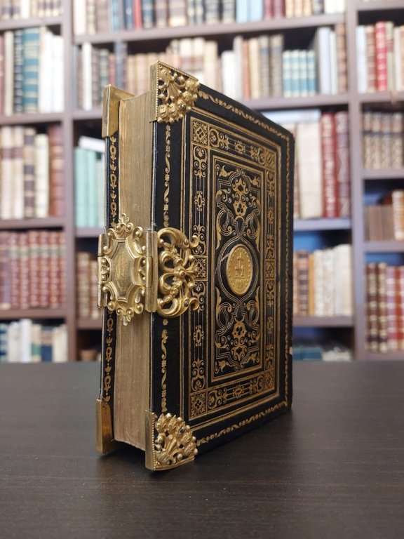 <span style="font-style: normal;">In-12° (cm. 14,1),</span> edizione originale dell'opera dell'ecclesiastico compositore Le Guillou nella tiratura speciale di lusso in <i>vélin satiné</i>, pp. [6] 464 [4] con aggiunta di pp. 16 di partiture musicali, 6 tavole illustrative f.t. (sporadiche fioriture). Invio autografo al Papa alla controguardia: «Deposto ai piedi della Sua Santità Gregorio XVI in testimonio della sua profonda venerazione ed ubedienza, per il suo divoto ed umilissimo servitore e figlio C. M. Le Guillou [.]». Esemplare particolarissimo in l<span style="font-style: normal;">egatura strettamente coeva di piena pelle scura assai ricca di decorazioni, dorso con titolo e fregi floreali che formano una ghirlanda inquadrata da filetti, ai piatti decorazioni romantiche a placca inquadrate in cornice e con Medaglia Miracolosa in oro incastonata nel campo di mezzo di entrambi, filetto ai labbri, </span><i>dentelles</i>, cantonali in oro di foggia floreale e fermaglio sempre in oro con inciso <i>Amour a notre Mere</i>; tagli dorati. Ottimo esemplare conservato in elegante custodia in mezza pelle con titolo in oro. [L]