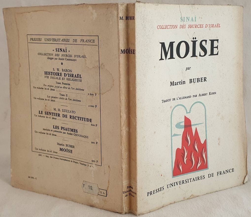 Monografia del 1957 sul personaggio di Mosè scritta da Martin Buber della collana "Sinai collection des sources d'Israel". In buone condizioni. Copertina editoriale in buone condizioni generali con lievi usure ai margini e dorso. Legatura in buone condizioni. Pagine in ottime condizioni con rare fioriture. In 8. Dim. 19,5x14,5 cm. Pp. 266+(2).Mongraphy of 1957 about Moses written by Martin Buber of the series "Sinai collection des sources d'Israel". In good conditions. Editorial cover in good general conditions slightly worn in the edges and spine. Binding in good conditions. Inside pages are in very good conditions with occasional foxings. In 8. Dim. 19,5x14,5 cm. Pp. 266+(2).