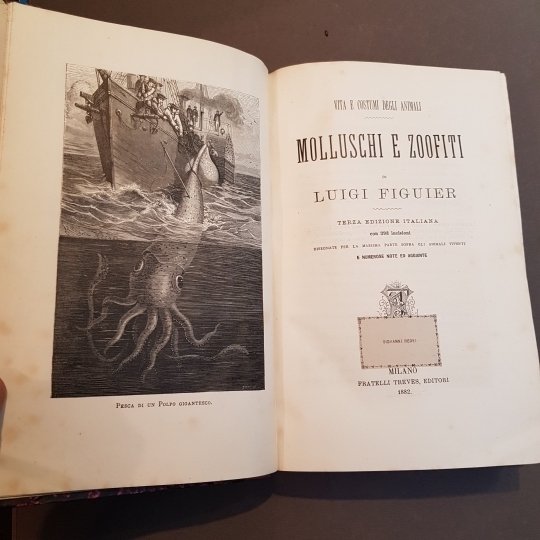 In-8°, pp. XIII, 518, centinaia di illustrazioni xilografiche n.t. e f.t., mezza pelle coeva, titolo in oro al dorso.