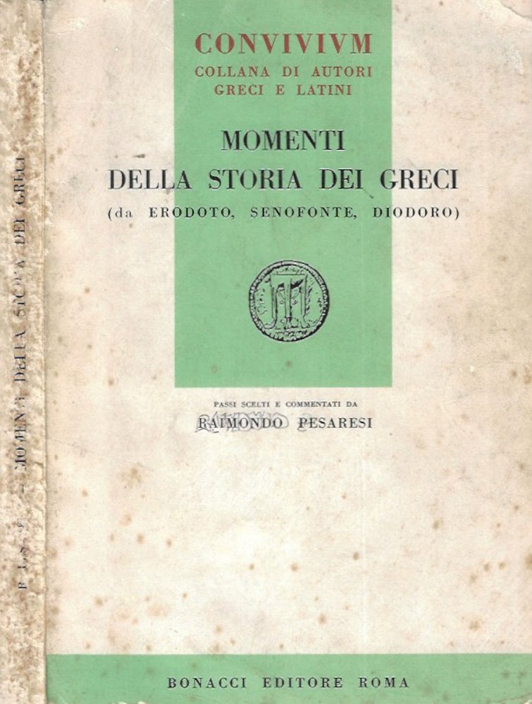 Brossura datata segnata dal tempo, passi scelti e commentati da R. Pesaresi, copertina usurata da attrito e sgualcita da manipolazione maggiormente alle estremità, cuffie, canaletti e dorso, sbiadita e sbucciata, appesantita da ombre di polvere e umido da scaffale, alterazione cromatica da esposizione alla luce maggiore in cornice e alla costa consunta da abrasioni, piccole pieghe alle punte dei fogli velati da ossidazione bruna intensa ai margini, qualche sottolineatura con matita e a penna, denso pulviscolo da umido ai tagli. N. pag. 246.