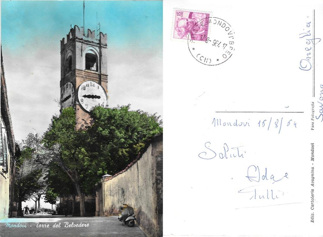 Mondovì (CN). Torre del Belvedere. Viaggiata 1964. Vespa