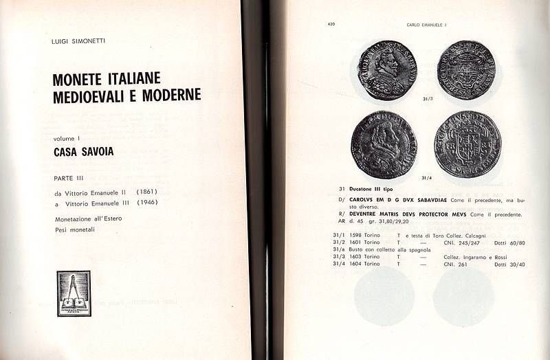 3 volumi in-8°, Legature in tutta pelle verde con fregi e titoli in oro ai dorsi e fregi in oro ai piatti. Cofanetti editoriali., pp. 486; 390; 438. Con 1 tavola genealogica ripiegata, stemmi a colori nel testo e migliaia di fotografie di monete. (Importante opera di consultazione. Vol-I°, Prima parte- Da Oddone-Conte (1056) a Carlo Emanuele, I Duca (1630). Vol-I°, Seconda parte - da Vittorio Amedeo I (1630) a Vittorio Emanuele II Re di Sardegna, (1861). Vol-I° Terza parte, Da Vittorio Emanuele II (1861) a Vittorio Emanuele III (1946). Monetazione all'Estero. Pesi monetali.